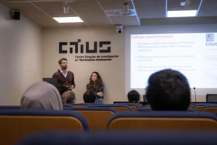 The digital transformation of the healthcare sector has generated a vast volume of data, yet its heterogeneity remains a significant barrier to progress. To address this challenge, Josa Prats i Valero, Lead Software Engineer, and Gabriel Bernardino, Ramon y Cajal Fellow, delivered a keynote lecture at CiTIUS titled: "Development of an Integrated Platform for Advanced Medical Research Based on AI".